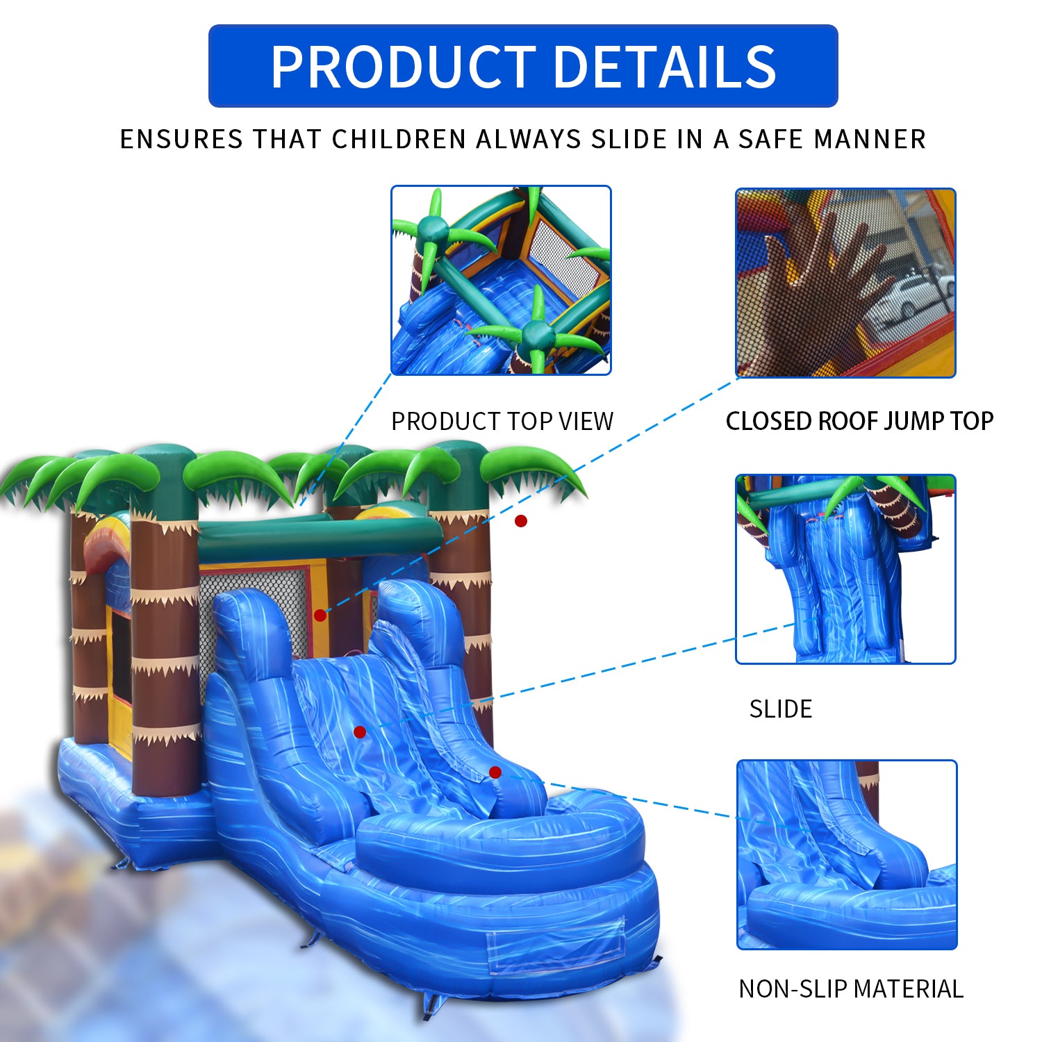 Introducing our top-tier Tropical Hideout Commercial Inflatable Water Slide, designed with an unwavering commitment to durability, safety, and supreme fun. Constructed with high woven density material, this slide exhibits superior tensile tear and peel resistance, making it exceptionally resilient for the most energetic play.