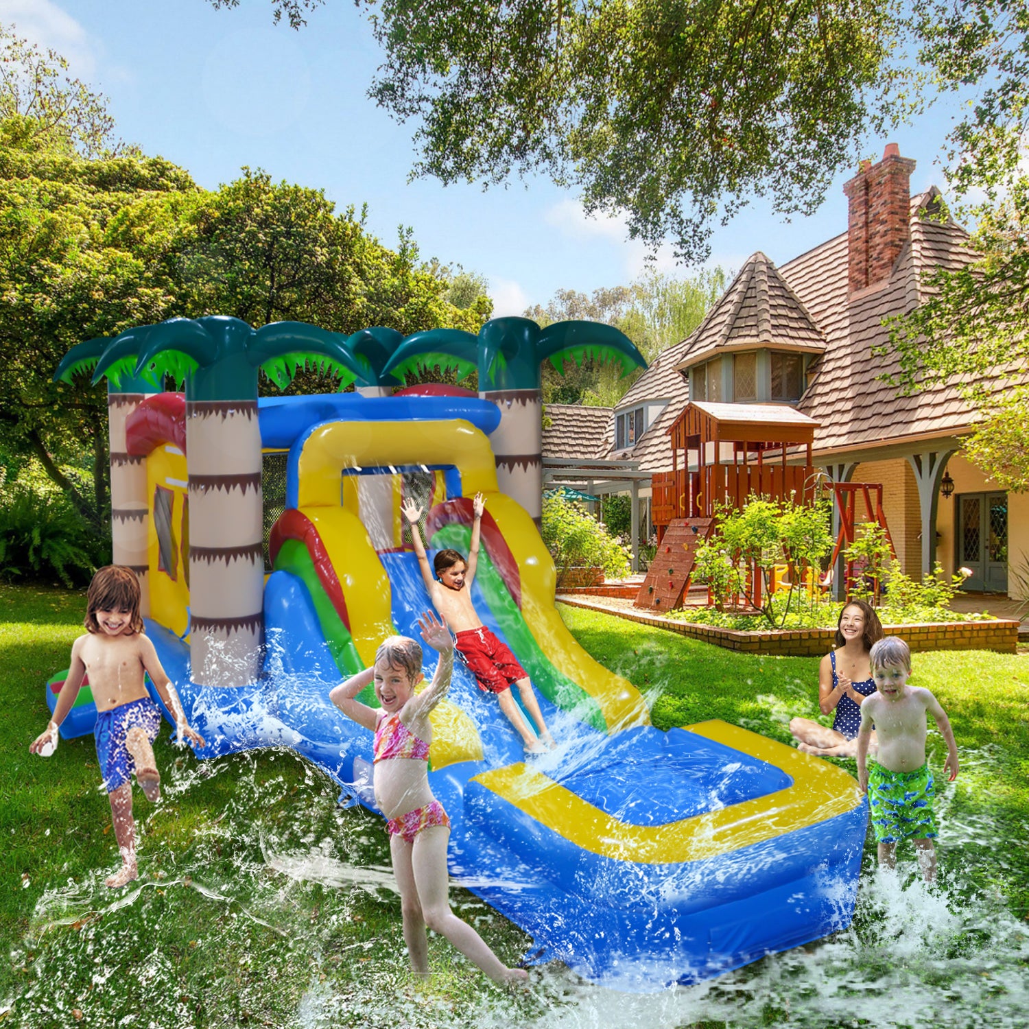 Introducing our top-tier Tropical Hideout Commercial Inflatable Water Slide, designed with an unwavering commitment to durability, safety, and supreme fun. Constructed with high woven density material, this slide exhibits superior tensile tear and peel resistance, making it exceptionally resilient for the most energetic play.
